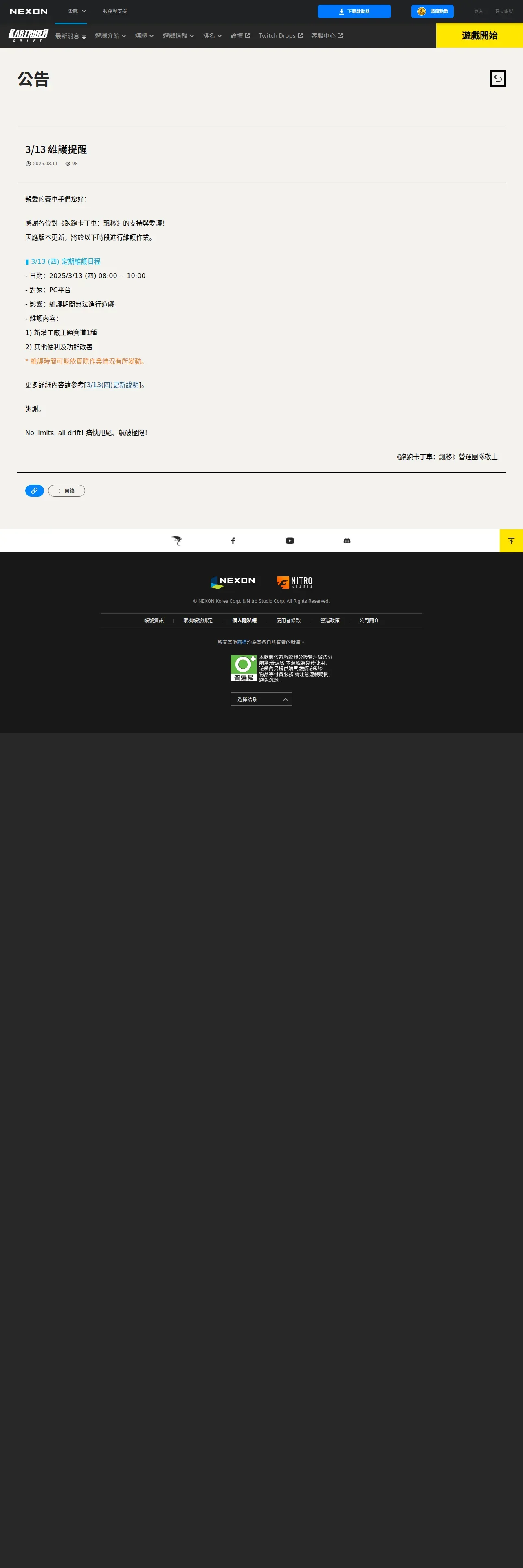 https://tw.nexon.com:443/kartdrift/zh/news/announcement/view?threadId=2745303