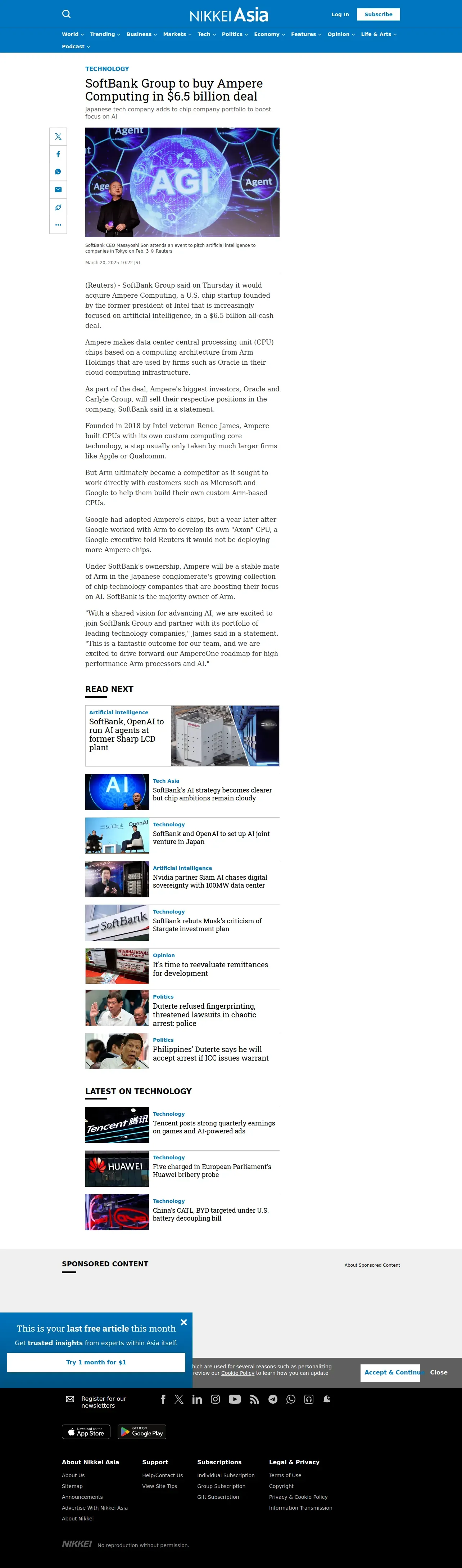 取得元URL: https://asia.nikkei.com:443/Business/Technology/SoftBank-Group-to-buy-Ampere-Computing-in-6.5-billion-deal