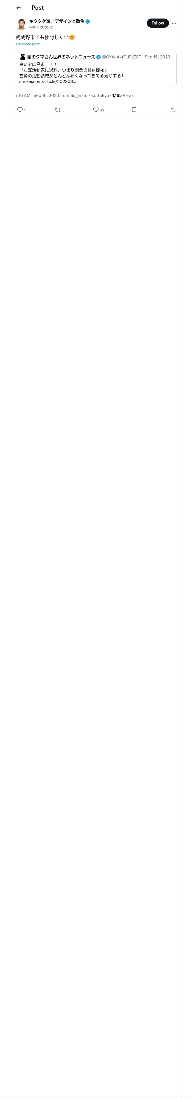 https://x.com:443/s_kikutake/status/1702808561620046262