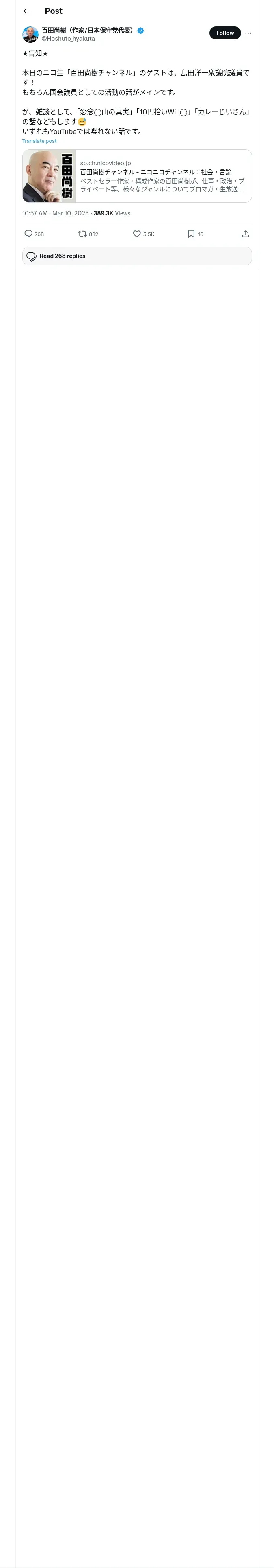 https://x.com:443/Hoshuto_hyakuta/status/1898916122973647018/quotes