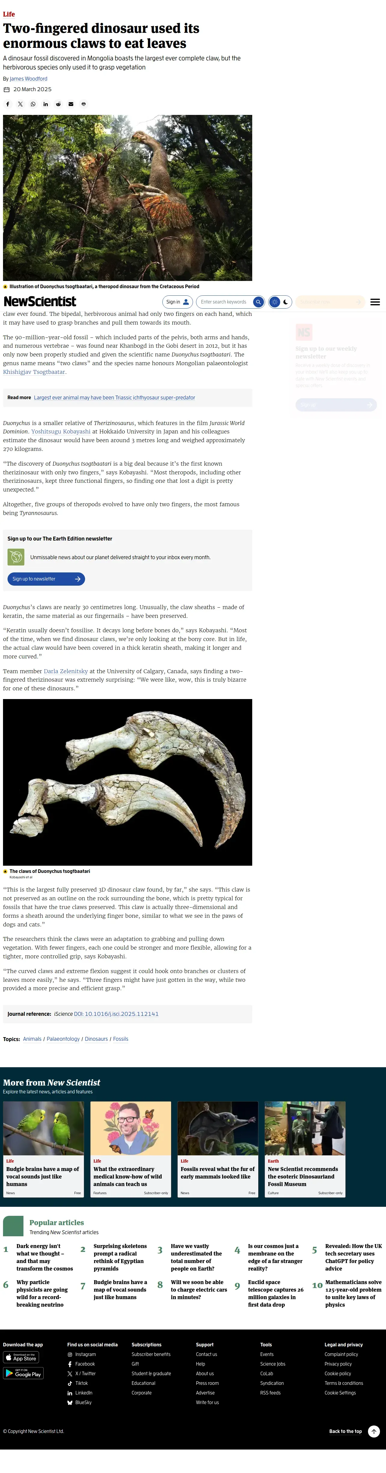 https://www.newscientist.com:443/article/2473027-two-fingered-dinosaur-used-its-enormous-claws-to-eat-leaves/