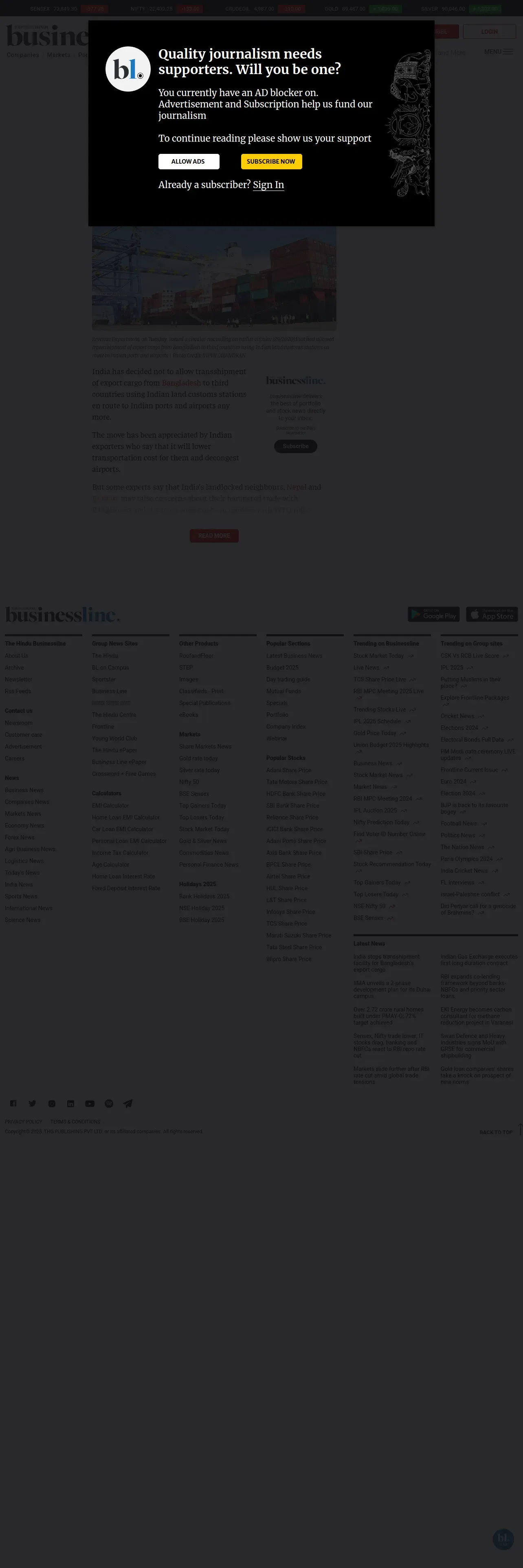 https://www.thehindubusinessline.com:443/economy/logistics/india-stops-transshipment-facility-for-bangladeshs-export-cargo/article69430488.ece