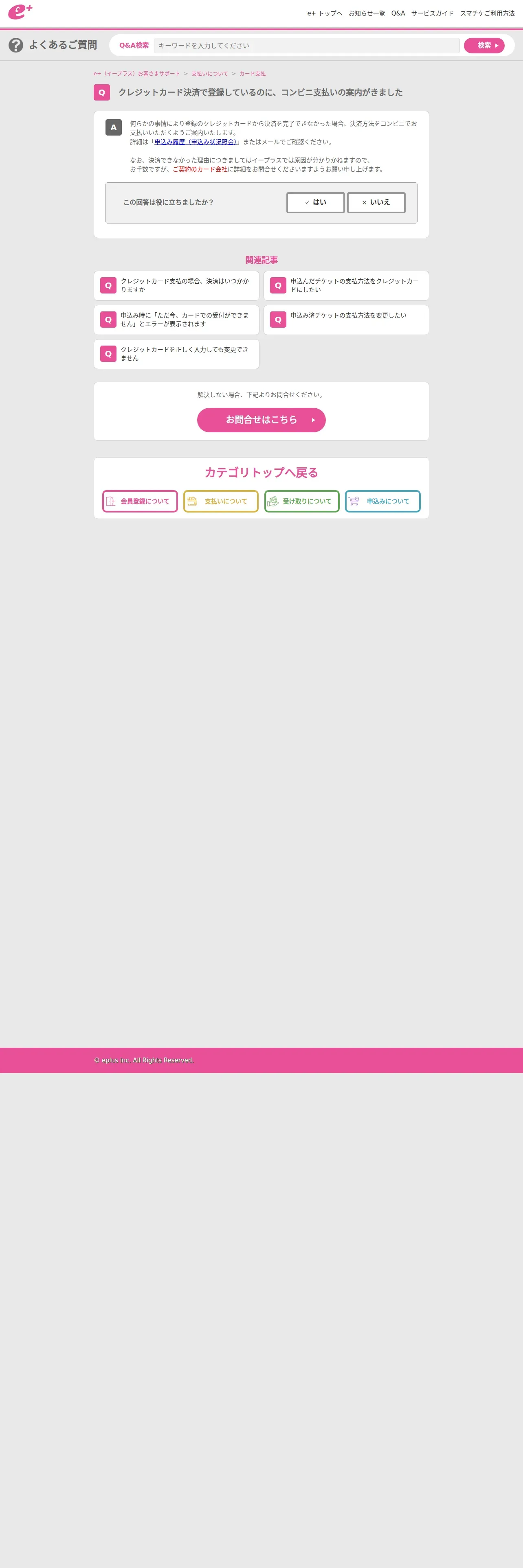 https://support-qa.eplus.jp:443/hc/ja/articles/360041176574-%E3%82%AF%E3%83%AC%E3%82%B8%E3%83%83%E3%83%88%E3%82%AB%E3%83%BC%E3%83%89%E6%B1%BA%E6%B8%88%E3%81%A7%E7%99%BB%E9%8C%B2%E3%81%97%E3%81%A6%E3%81%84%E3%82%8B%E3%81%AE%E3%81%AB-%E3%82%B3%E3%83%B3%E3%83%93%E3%83%8B%E6%94%AF%E6%89%95%E3%81%84%E3%81%AE%E6%A1%88%E5%86%85%E3%81%8C%E3%81%8D%E3%81%BE%E3%81%97%E3%81%9F