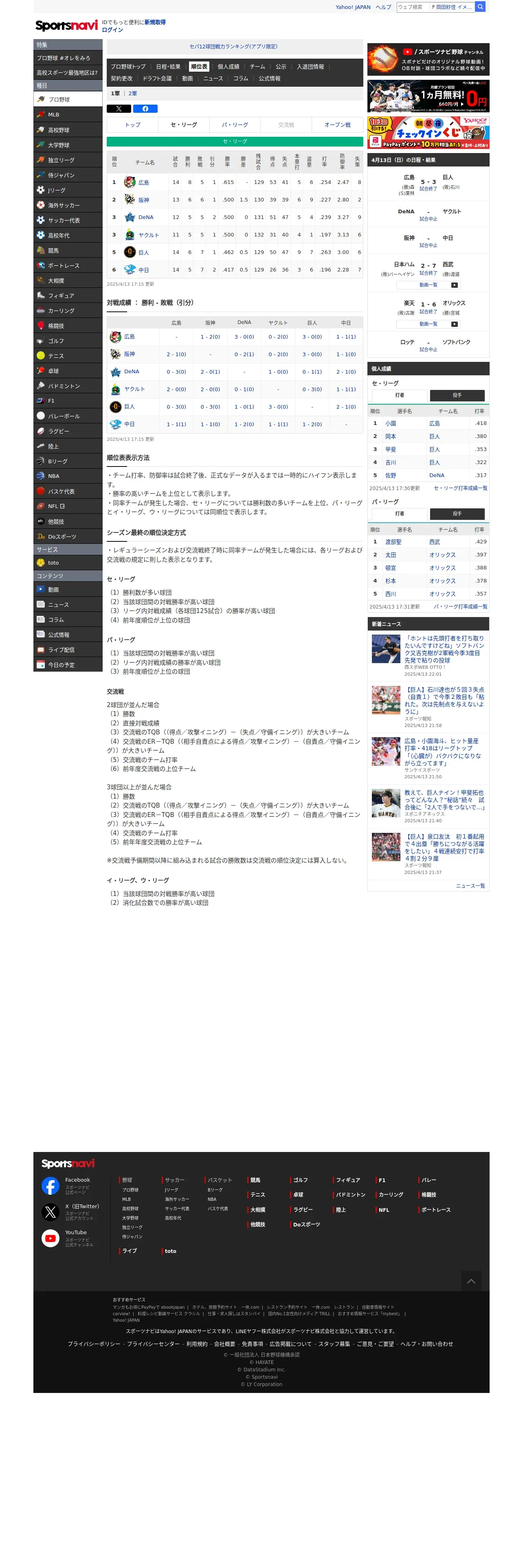 https://baseball.yahoo.co.jp:443/npb/standings/detail/1