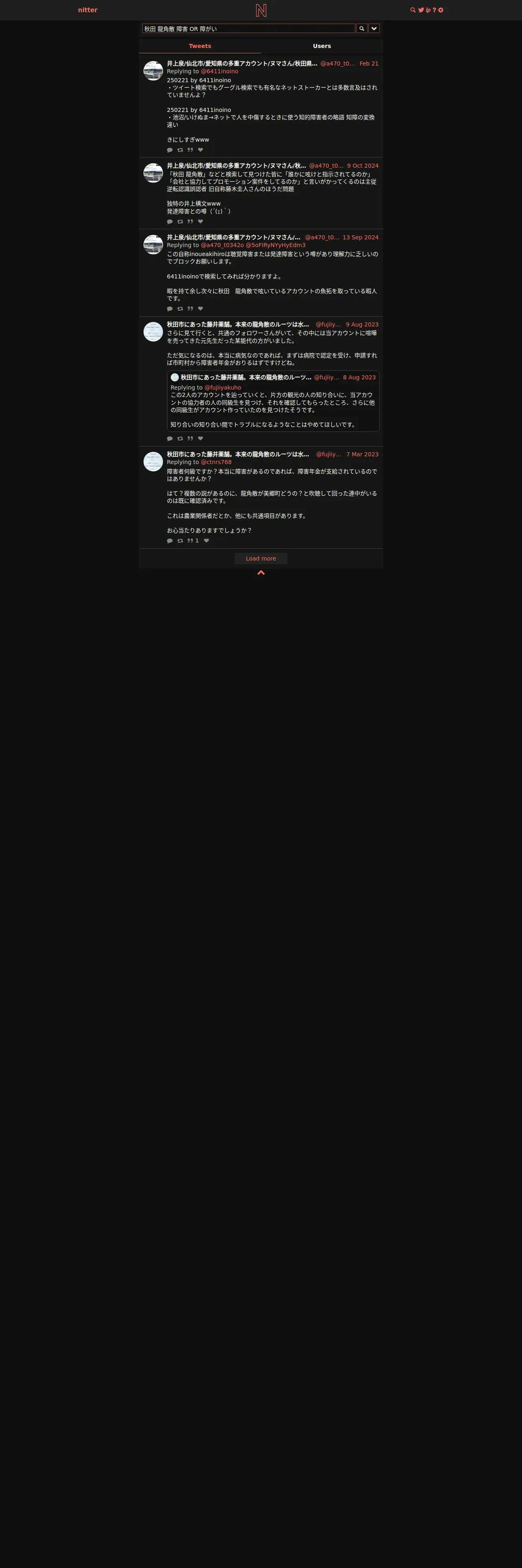 https://nitter.net:443/search?f=tweets&q=%E7%A7%8B%E7%94%B0+%E9%BE%8D%E8%A7%92%E6%95%A3+%E9%9A%9C%E5%AE%B3+OR+%E9%9A%9C%E3%81%8C%E3%81%84