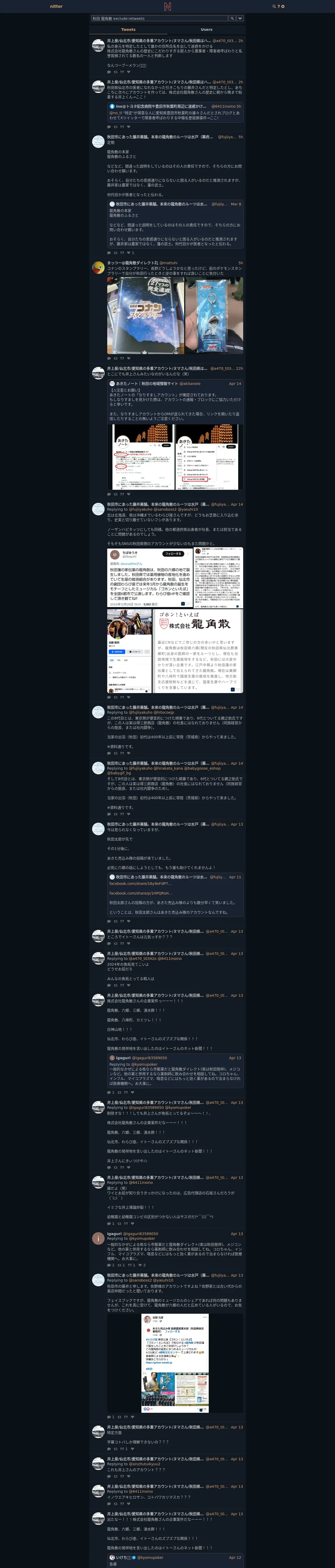 https://nitter.space:443/search?f=tweets&q=%E7%A7%8B%E7%94%B0+%E9%BE%8D%E8%A7%92%E6%95%A3+exclude%3Aretweets&since=&until=&near=