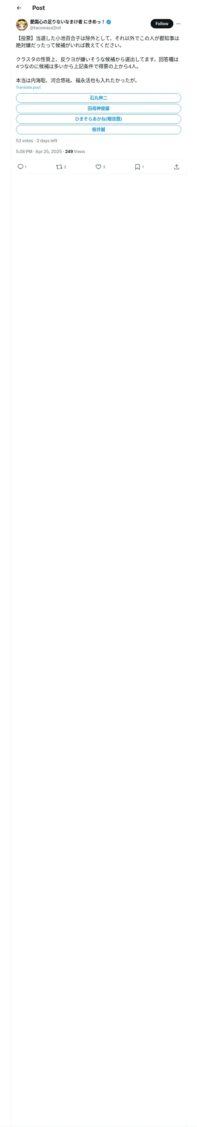 https://x.com:443/tacowasa2nd/status/1915686782316011892?t=ElpN0qNzT53EL_GNHN9anQ&s=19