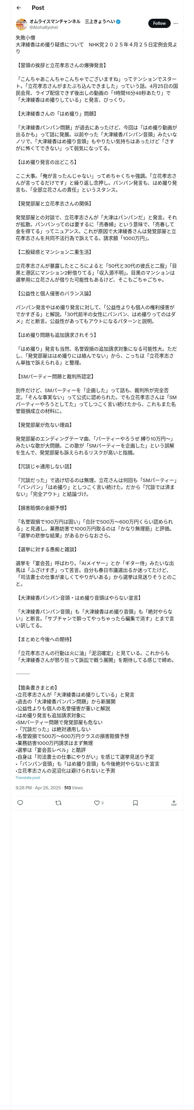 取得元URL: https://x.com:443/AlohaKyohei/status/1916107038943478213
