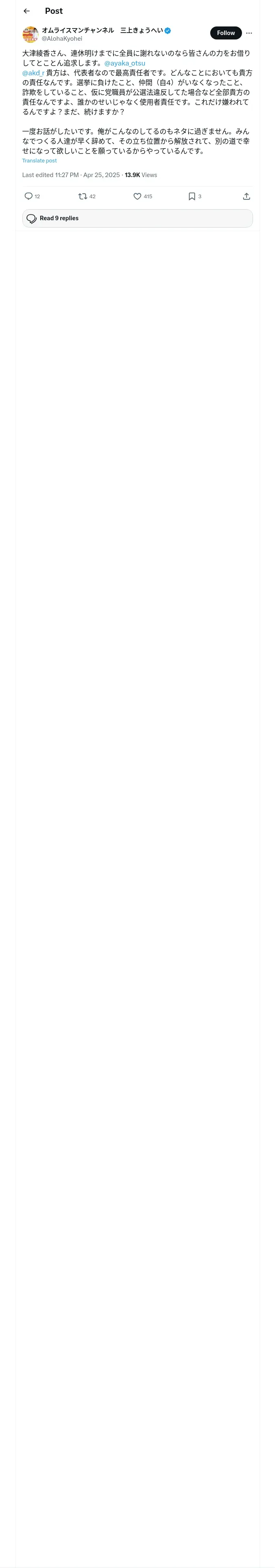 取得元URL: https://x.com:443/AlohaKyohei/status/1915774550077510000