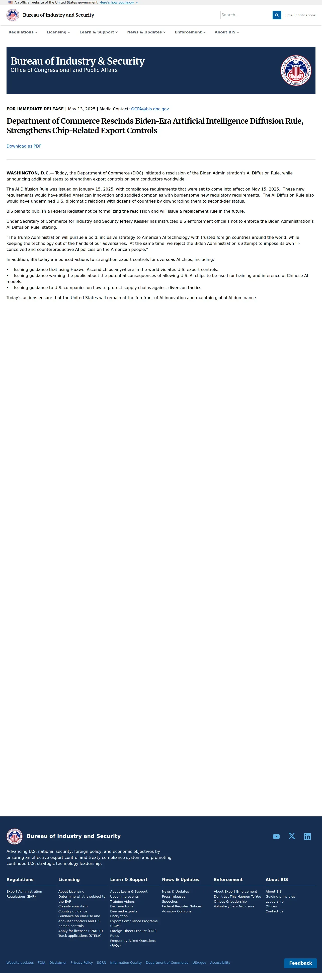https://www.bis.gov:443/press-release/department-commerce-rescinds-biden-era-artificial-intelligence-diffusion-rule-strengthens-chip-related