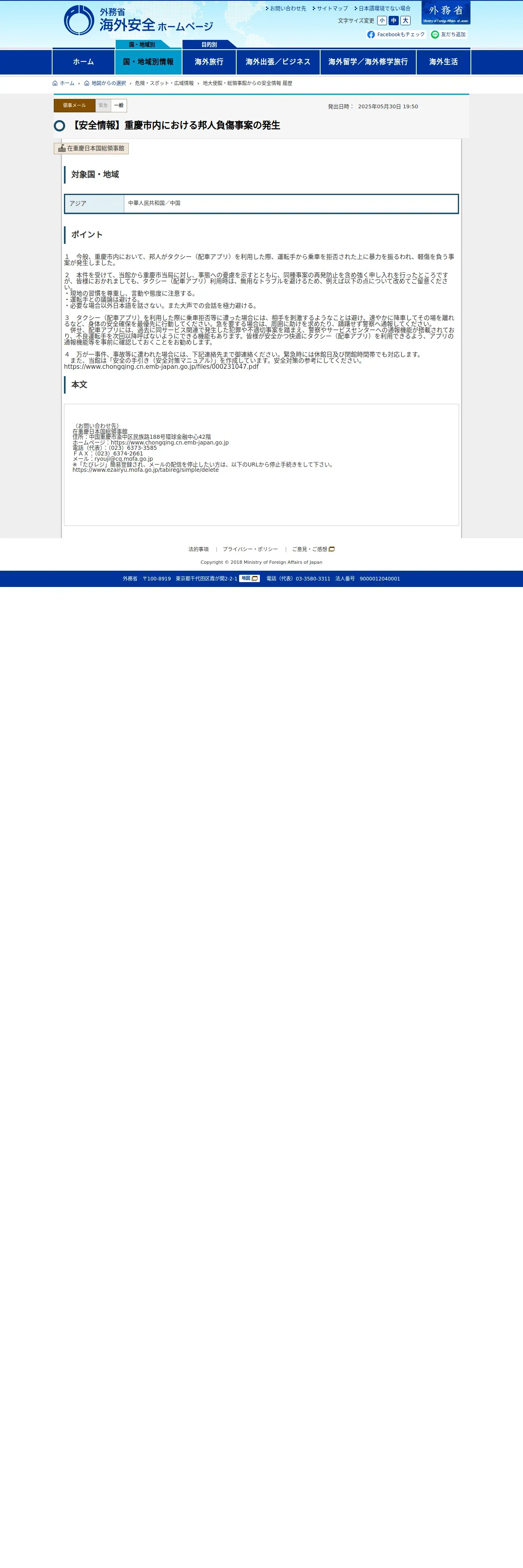 取得元URL: https://www.anzen.mofa.go.jp:443/od/ryojiMailDetail.html?keyCd=157418