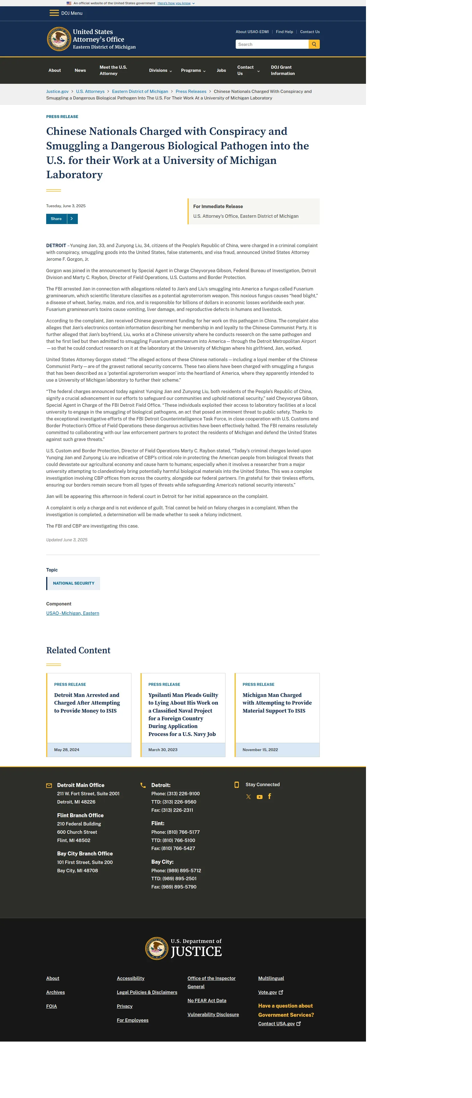 https://www.justice.gov:443/usao-edmi/pr/chinese-nationals-charged-conspiracy-and-smuggling-dangerous-biological-pathogen-us