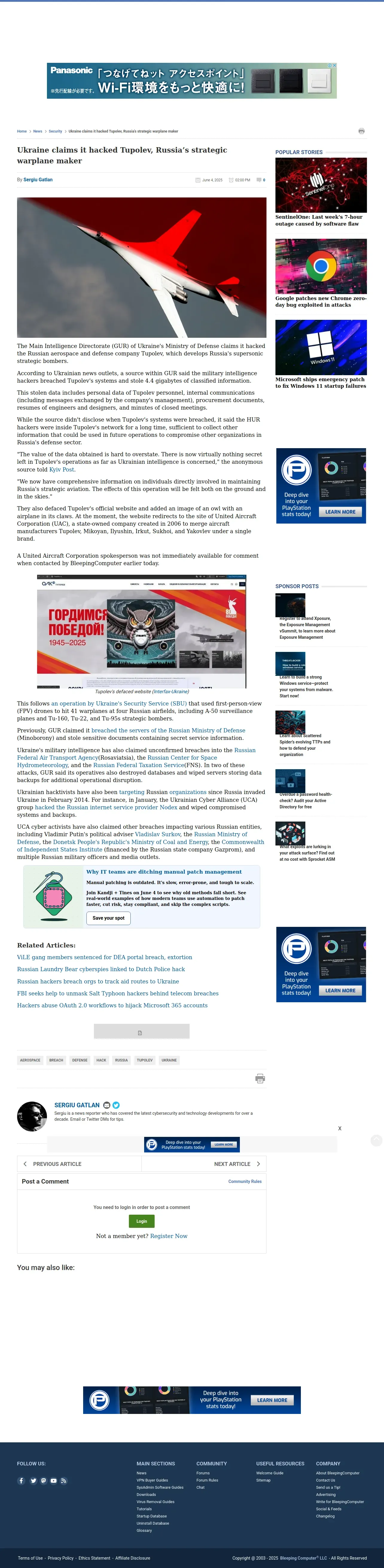 https://www.bleepingcomputer.com:443/news/security/ukraine-claims-it-hacked-tupolev-russias-strategic-warplane-maker/