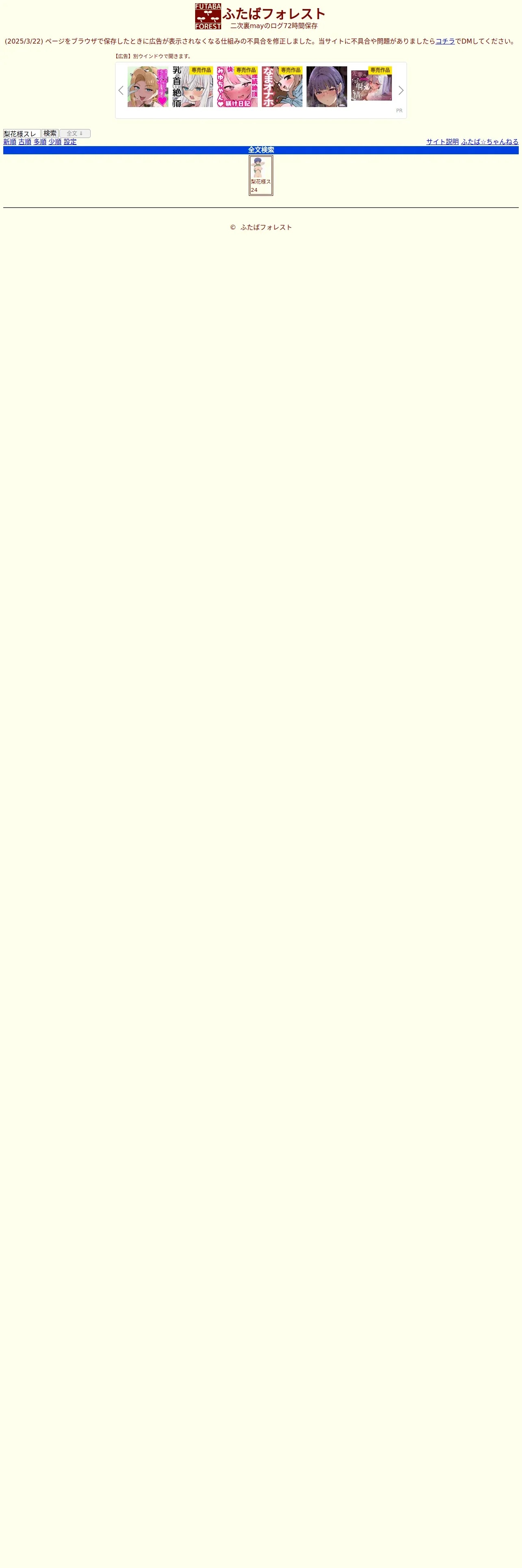 https://futabaforest.net:443/index.htm?sm=2&words=%E6%A2%A8%E8%8A%B1%E6%A7%98%E3%82%B9%E3%83%AC