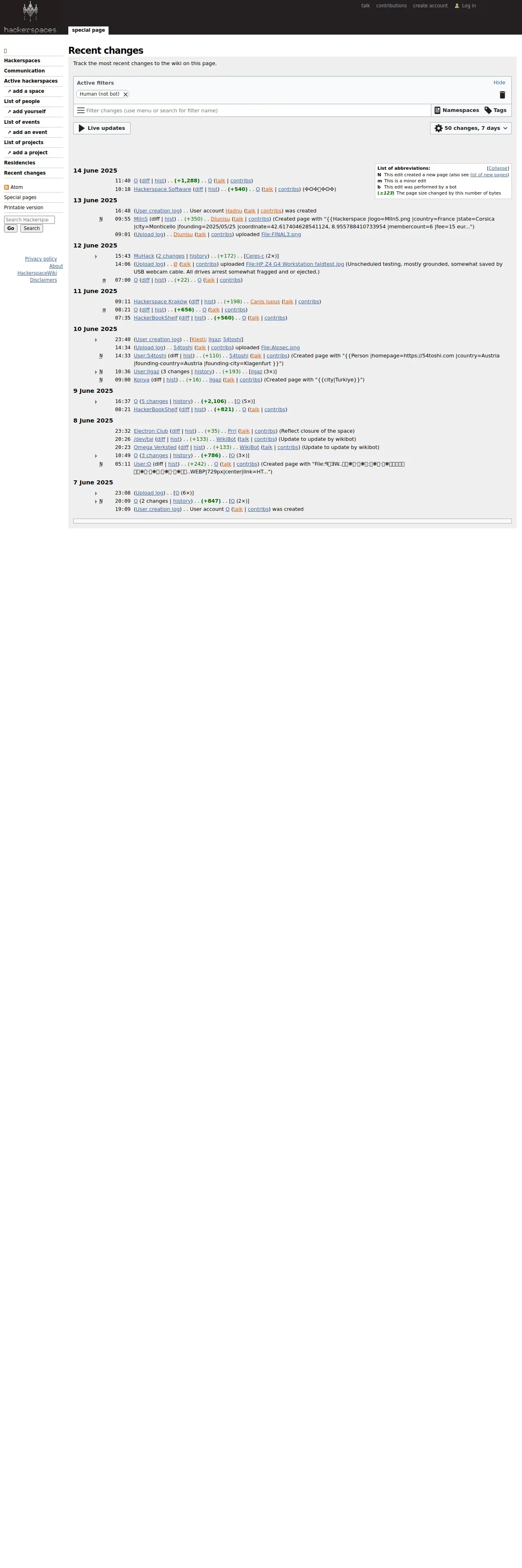 https://wiki.hackerspaces.org:443/Special:RecentChanges?hidebots=1