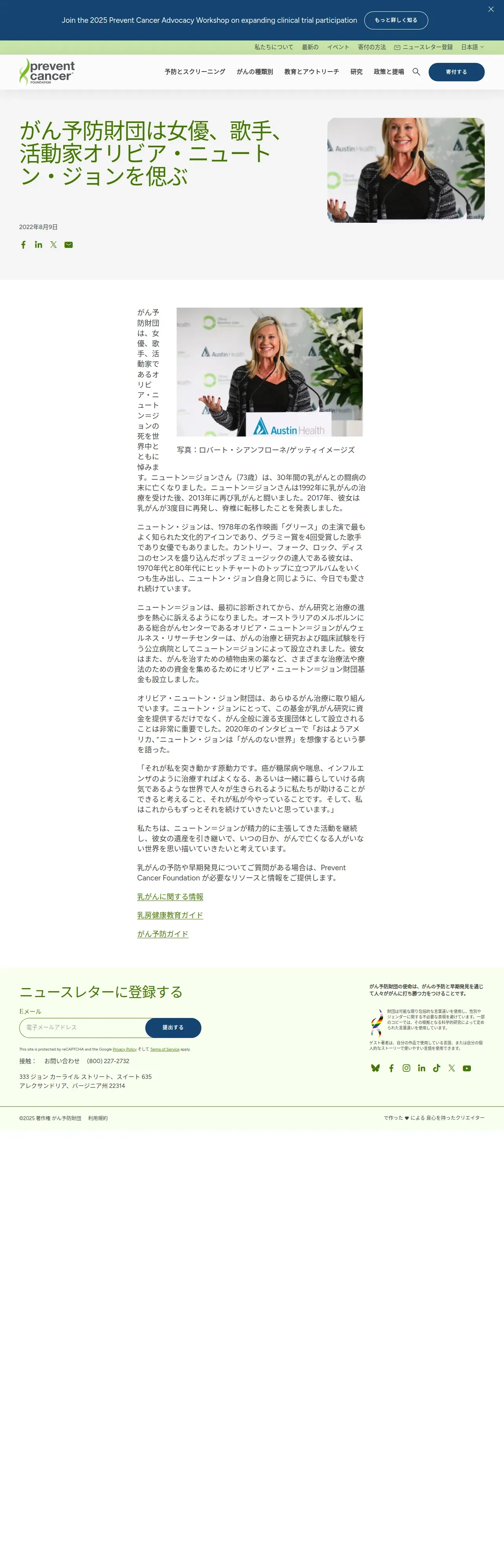 https://preventcancer.org:443/ja/news/prevent-cancer-foundation-remembers-actress-singer-and-advocate-olivia-newton-john/