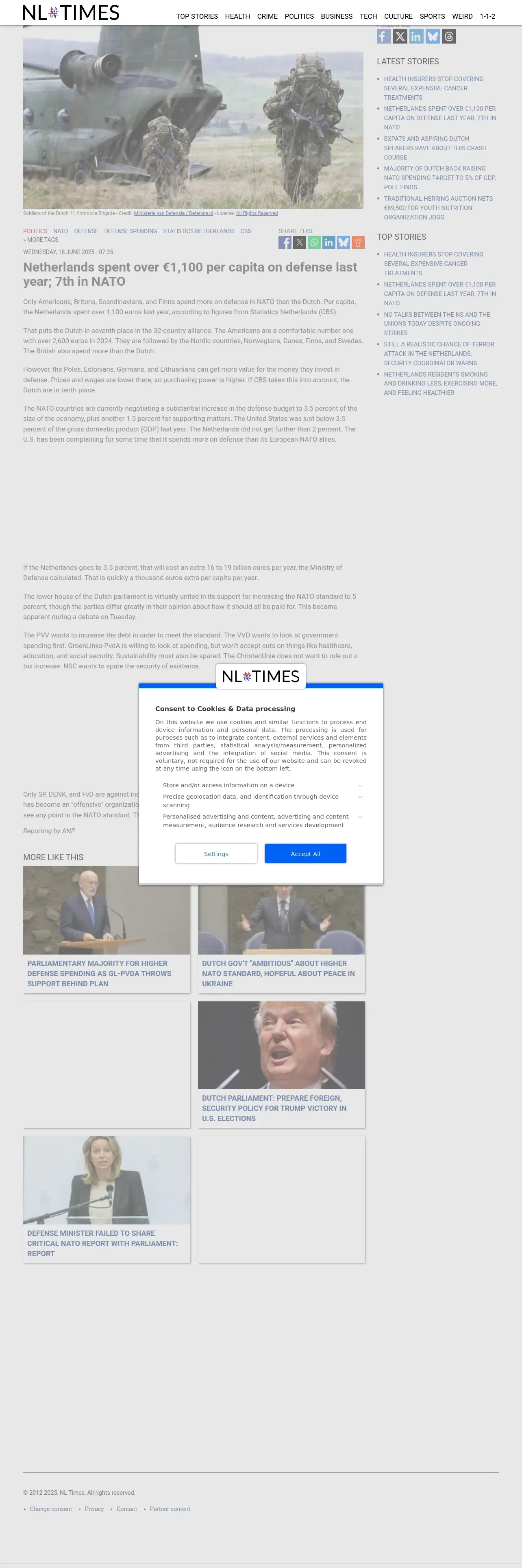 https://nltimes.nl:443/2025/06/18/netherlands-spent-eu1100-per-capita-defense-last-year-7th-nato