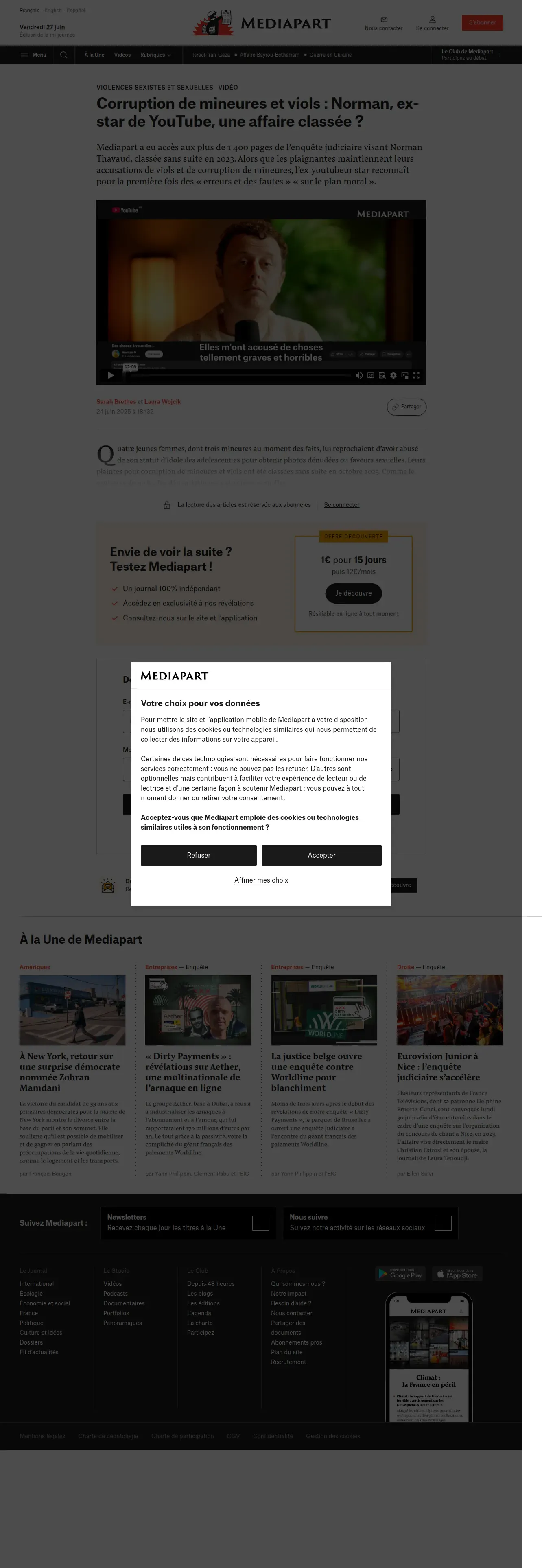 https://www.mediapart.fr:443/journal/france/240625/corruption-de-mineures-et-viols-norman-ex-star-de-youtube-une-affaire-classee