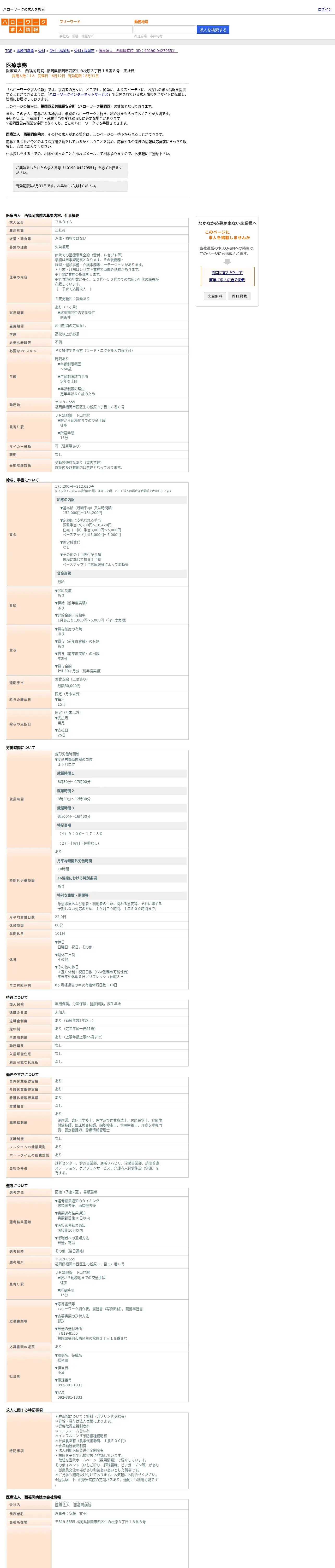 https://www.hellowork.careers:443/%E5%8C%BB%E7%99%82%E6%B3%95%E4%BA%BA%E3%80%80%E8%A5%BF%E7%A6%8F%E5%B2%A1%E7%97%85%E9%99%A2%E3%81%A7%E3%81%AE%E5%8C%BB%E7%99%82%E4%BA%8B%E5%8B%99%E3%81%AE%E3%83%8F%E3%83%AD%E3%83%BC%E3%83%AF%E3%83%BC%E3%82%AF%E6%B1%82%E4%BA%BA%E6%83%85%E5%A0%B1%EF%BC%88%E7%A6%8F%E5%B2%A1%E7%9C%8C%E7%A6%8F%E5%B2%A1%E5%B8%82%E8%A5%BF%E5%8C%BA%EF%BC%89-%2040190-04279551/