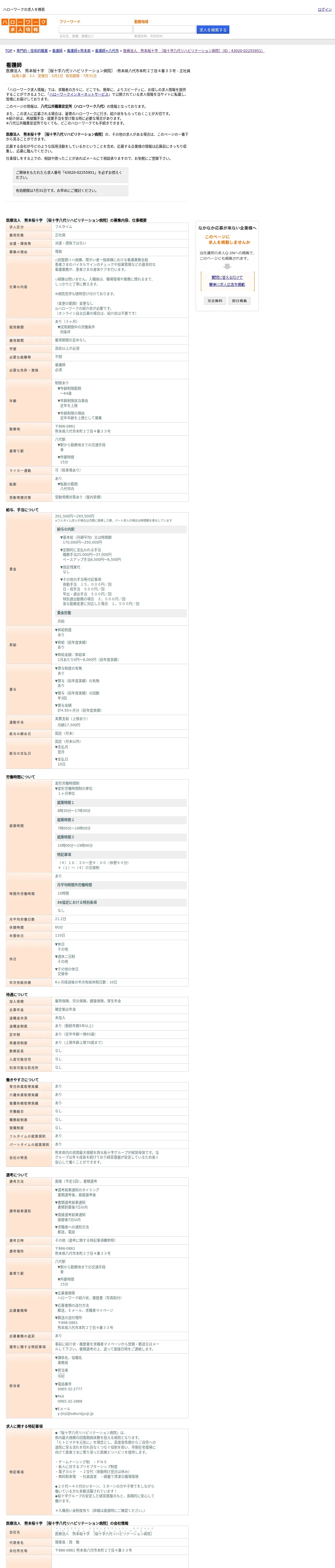 https://www.hellowork.careers:443/%E5%8C%BB%E7%99%82%E6%B3%95%E4%BA%BA%E3%80%80%E7%86%8A%E6%9C%AC%E6%A1%9C%E5%8D%81%E5%AD%97%E3%80%80%EF%BC%BB%E6%A1%9C%E5%8D%81%E5%AD%97%E5%85%AB%E4%BB%A3%E3%83%AA%E3%83%8F%E3%83%93%E3%81%A7%E3%81%AE%E7%9C%8B%E8%AD%B7%E5%B8%AB%E3%81%AE%E3%83%8F%E3%83%AD%E3%83%BC%E3%83%AF%E3%83%BC%E3%82%AF%E6%B1%82%E4%BA%BA%E6%83%85%E5%A0%B1%EF%BC%88%E7%86%8A%E6%9C%AC%E7%9C%8C%E5%85%AB%E4%BB%A3%E5%B8%82%EF%BC%89-%2043020-02255951/