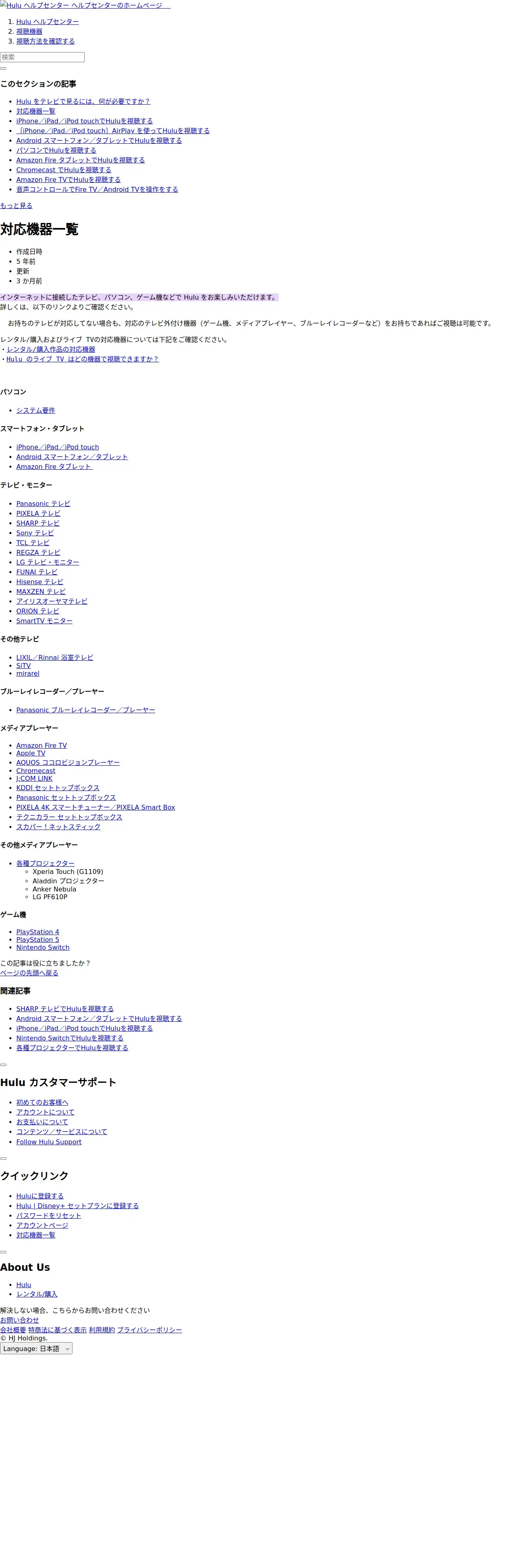 https://help.hulu.jp:443/hc/ja/articles/360044165674-%E5%AF%BE%E5%BF%9C%E6%A9%9F%E5%99%A8%E4%B8%80%E8%A6%A7#:~:text=%E3%82%A4%E3%83%B3%E3%82%BF%E3%83%BC%E3%83%8D%E3%83%83%E3%83%88%E3%81%AB%E6%8E%A5%E7%B6%9A%E3%81%97%E3%81%9F%E3%83%86%E3%83%AC%E3%83%93,%E3%82%92%E3%81%8A%E6%A5%BD%E3%81%97%E3%81%BF%E3%81%84%E3%81%9F%E3%81%A0%E3%81%91%E3%81%BE%E3%81%99%E3%80%82