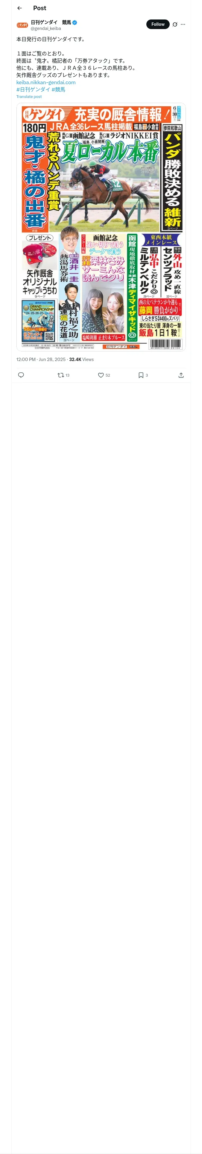 https://x.com:443/gendai_keiba/status/1938794575692472423