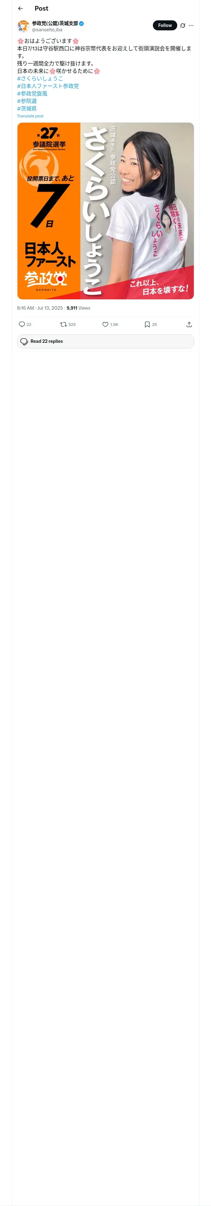 取得元URL: https://x.com:443/sanseito_iba/status/1944174089557749791