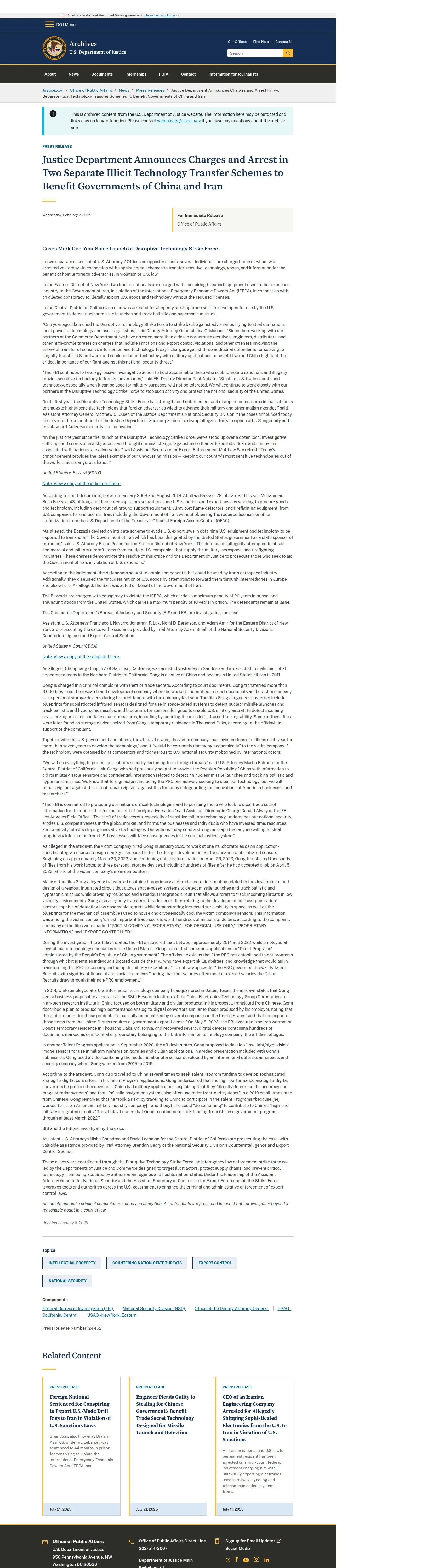 https://www.justice.gov:443/opa/pr/justice-department-announces-charges-and-arrest-two-separate-illicit-technology-transfer