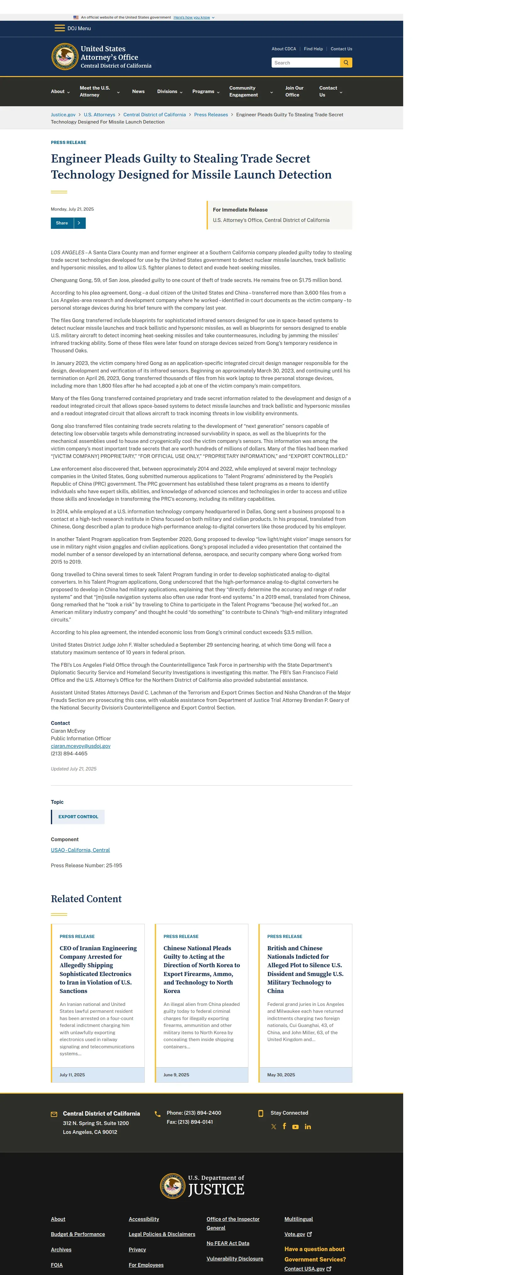 https://www.justice.gov:443/usao-cdca/pr/engineer-pleads-guilty-stealing-trade-secret-technology-designed-missile-launch