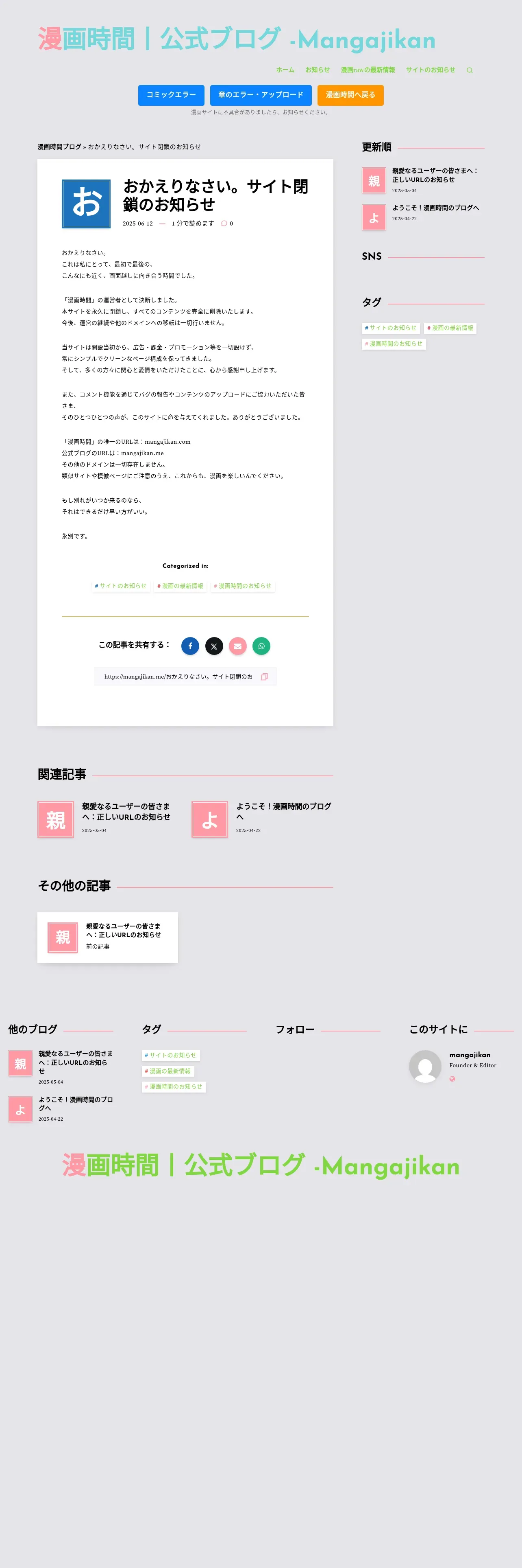 https://mangajikan.me:443/%E3%81%8A%E3%81%8B%E3%81%88%E3%82%8A%E3%81%AA%E3%81%95%E3%81%84%E3%80%82%E3%82%B5%E3%82%A4%E3%83%88%E9%96%89%E9%8E%96%E3%81%AE%E3%81%8A%E7%9F%A5%E3%82%89%E3%81%9B/