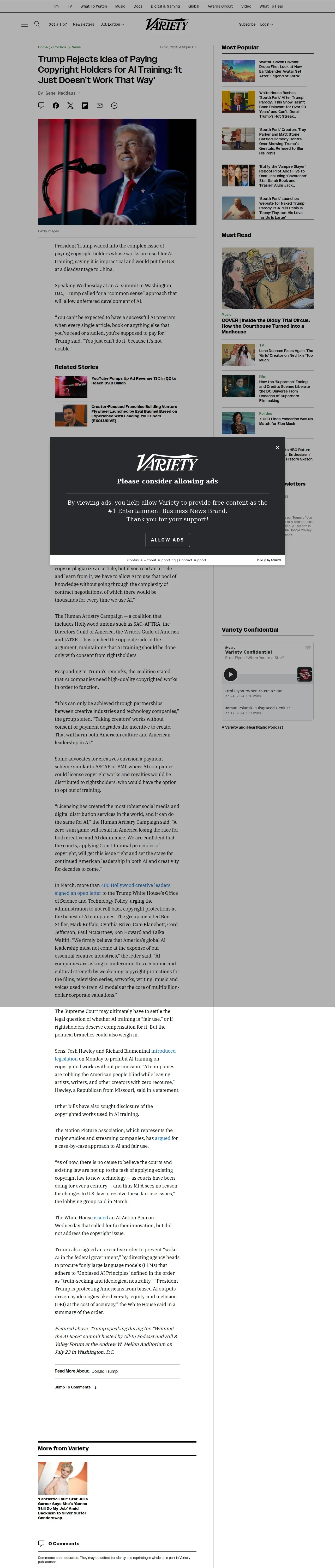 https://variety.com:443/2025/politics/news/trump-rejects-ai-training-compensation-1236468459/