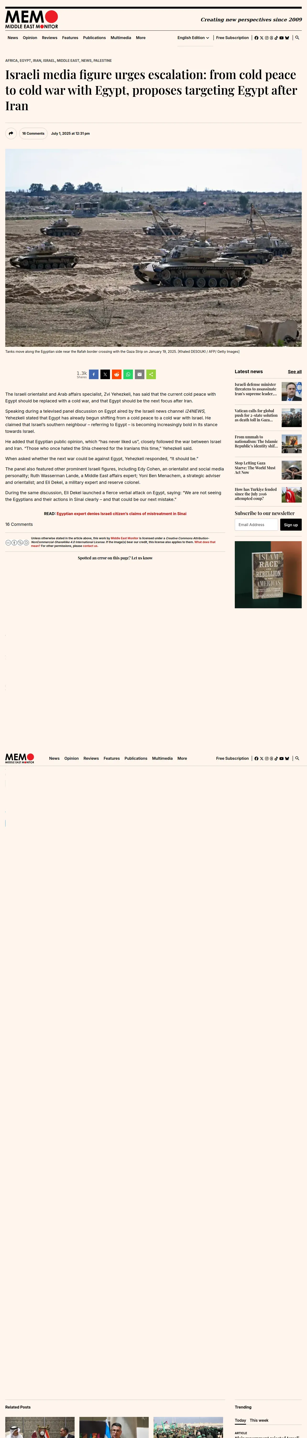 https://www.middleeastmonitor.com:443/20250701-israeli-media-figure-urges-escalation-from-cold-peace-to-cold-war-with-egypt-proposes-targeting-egypt-after-iran/