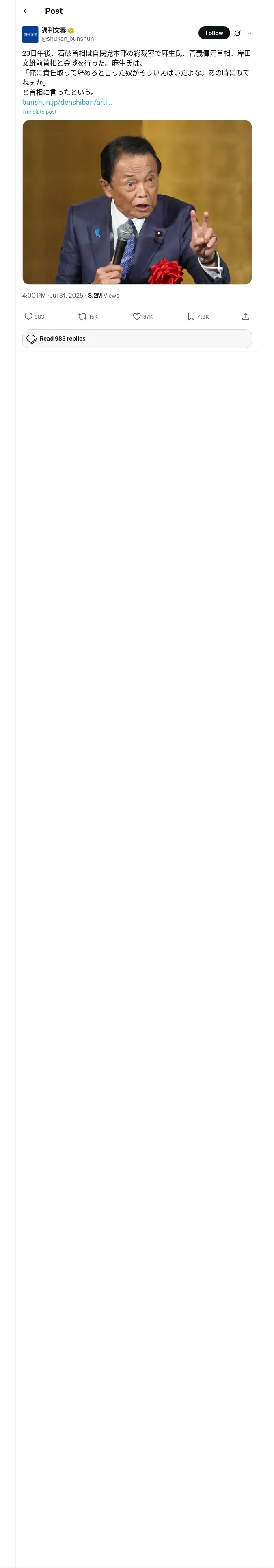 取得元URL: https://x.com:443/shukan_bunshun/status/1950813732830916809