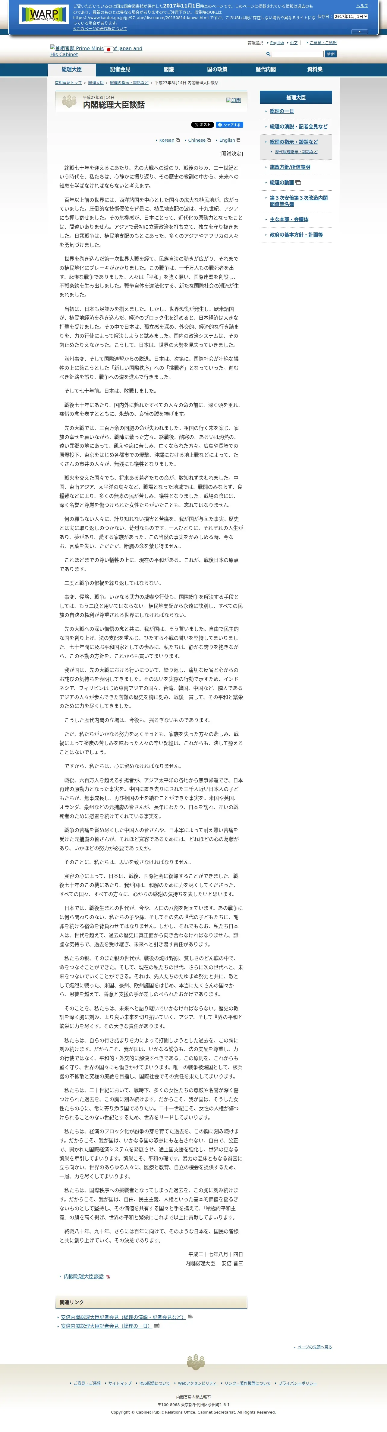 https://warp.ndl.go.jp:443/info:ndljp/pid/10992693/www.kantei.go.jp/jp/97_abe/discource/20150814danwa.html