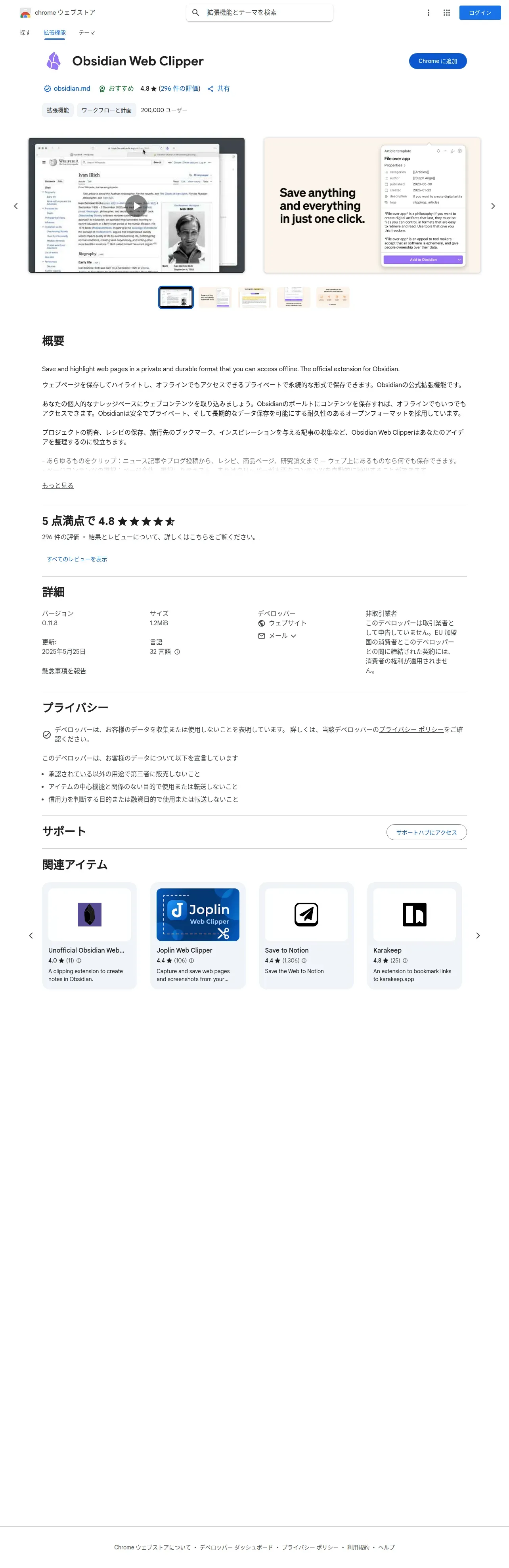 https://chromewebstore.google.com:443/detail/obsidian-web-clipper/cnjifjpddelmedmihgijeibhnjfabmlf?hl=ja