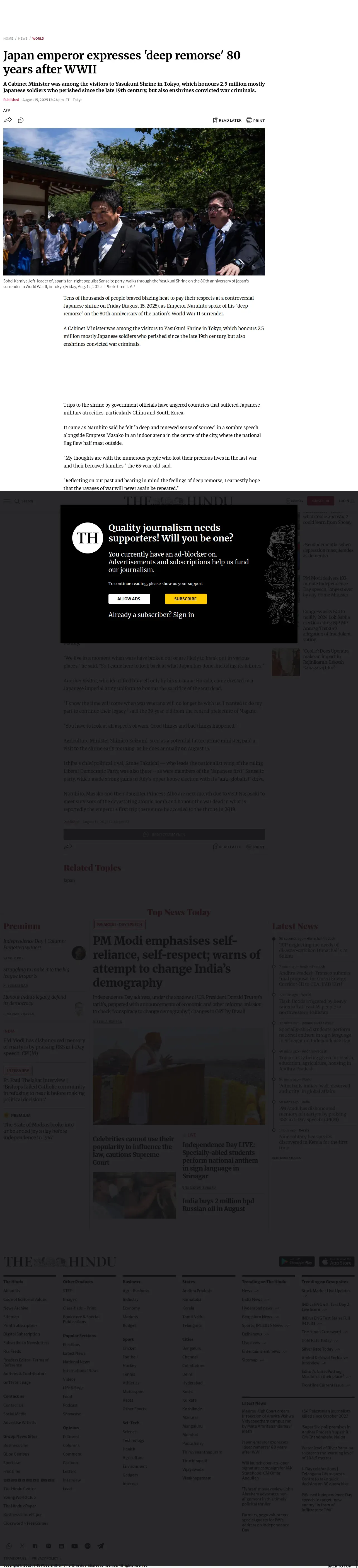 https://www.thehindu.com:443/news/international/japan-emperor-expresses-deep-remorse-80-years-after-wwii/article69936151.ece?utm_source=flipboard&utm_medium=activitypub