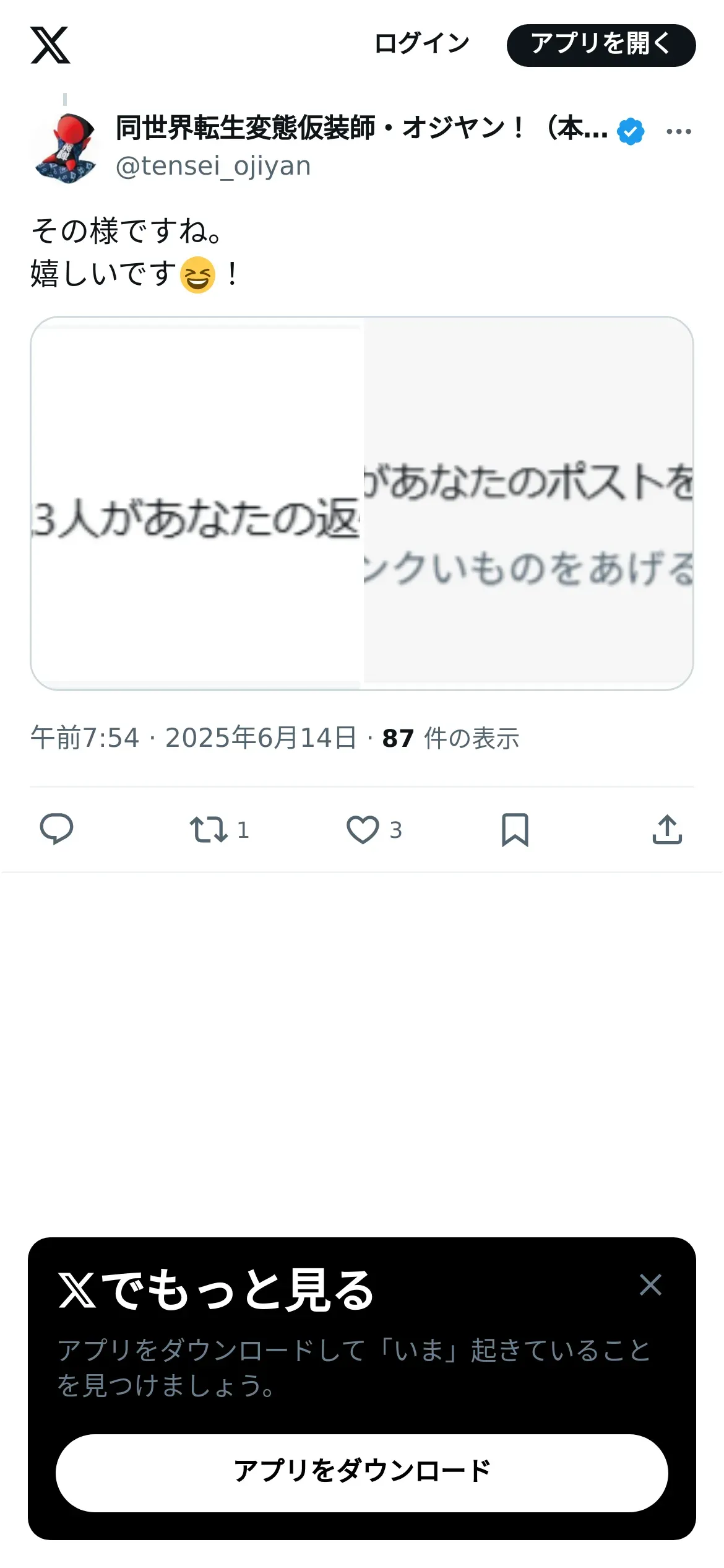 https://x.com:443/tensei_ojiyan/status/1933659254147461394?t=FwZxbFypid2Fsl5ikio_yg&s=19