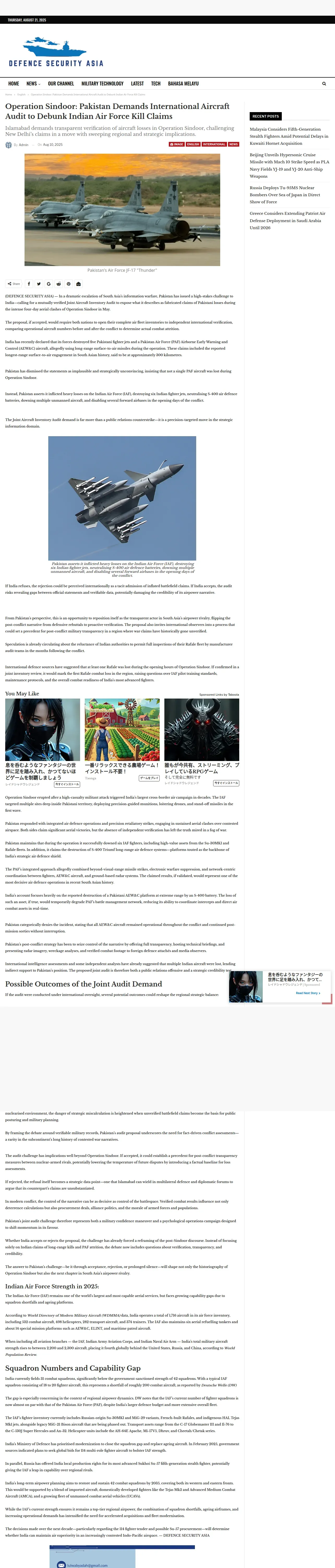 https://defencesecurityasia.com:443/en/operation-sindoor-pakistan-aircraft-audit-to-debunk-iaf-claims/