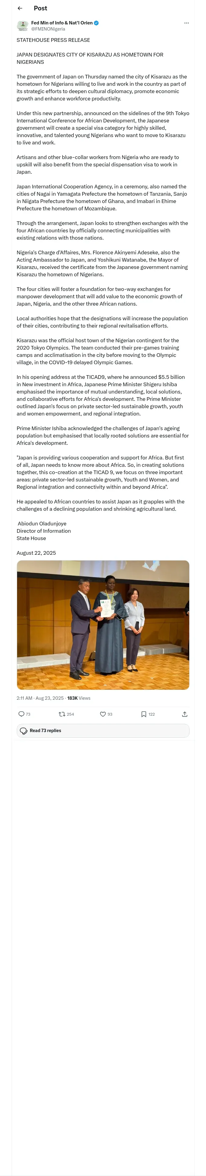 取得元URL: https://x.com:443/FMINONigeria/status/1958939981562462677