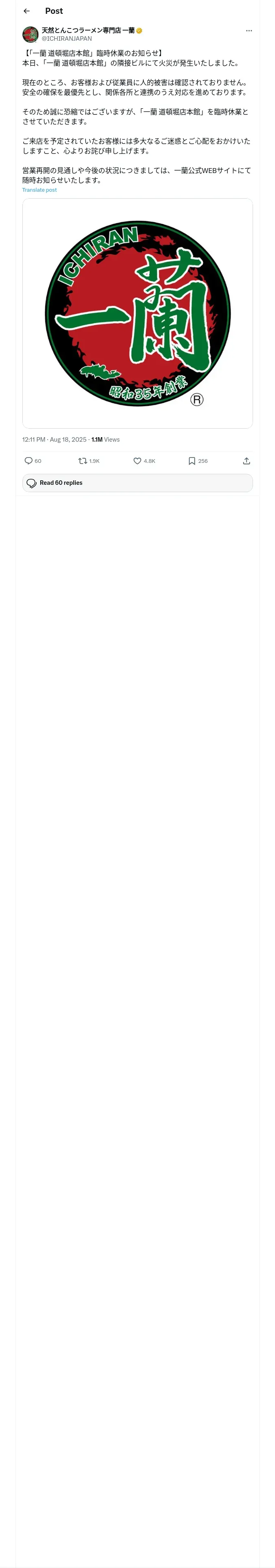 取得元URL: https://x.com:443/ICHIRANJAPAN/status/1957279068531122340