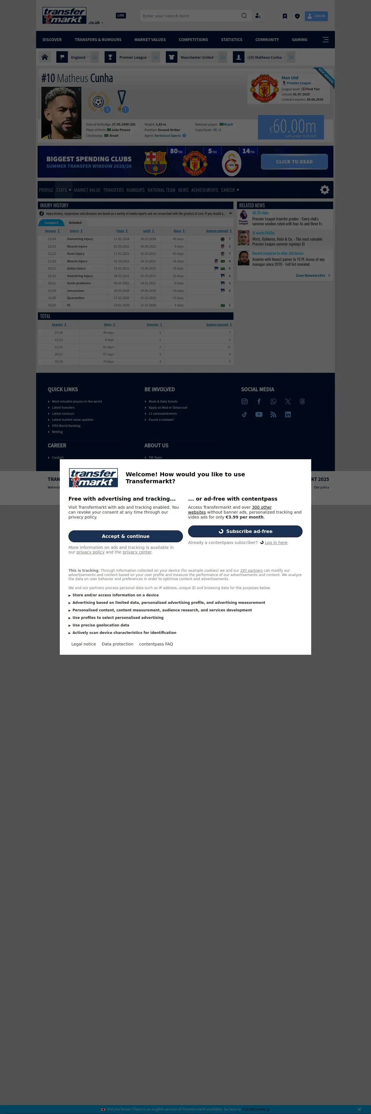 取得元URL: https://www.transfermarkt.co.uk:443/matheus-cunha/verletzungen/spieler/517894