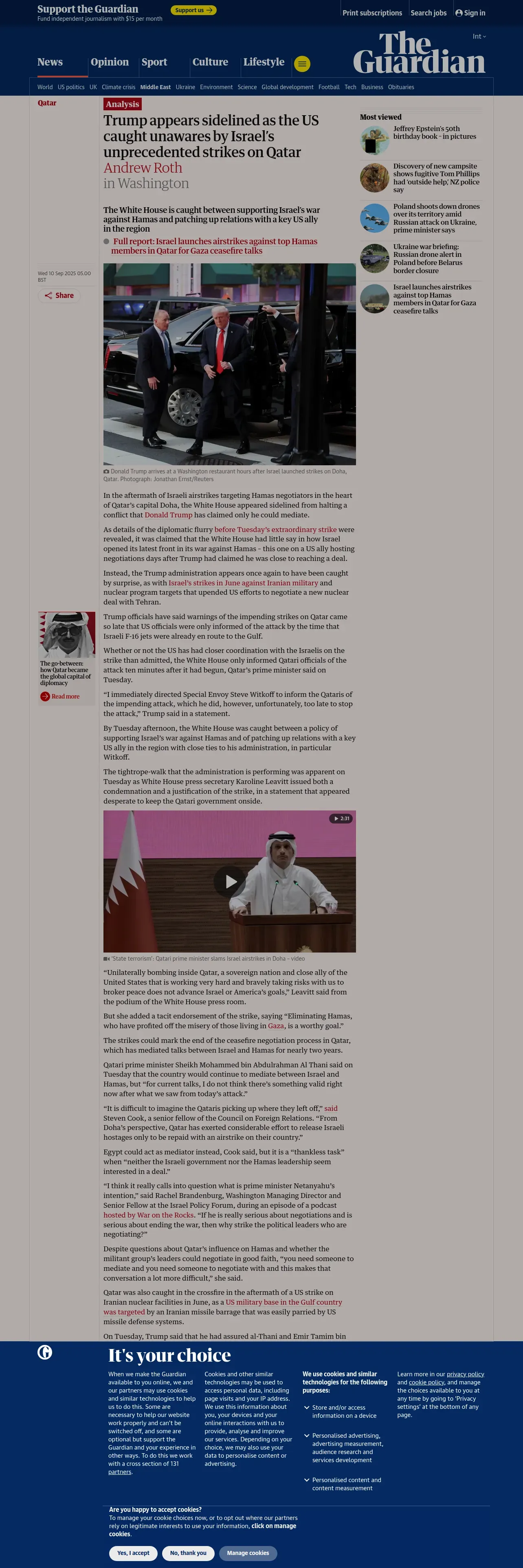 取得元URL: https://www.theguardian.com:443/world/2025/sep/10/trump-us-israel-hamas-strike-qatar