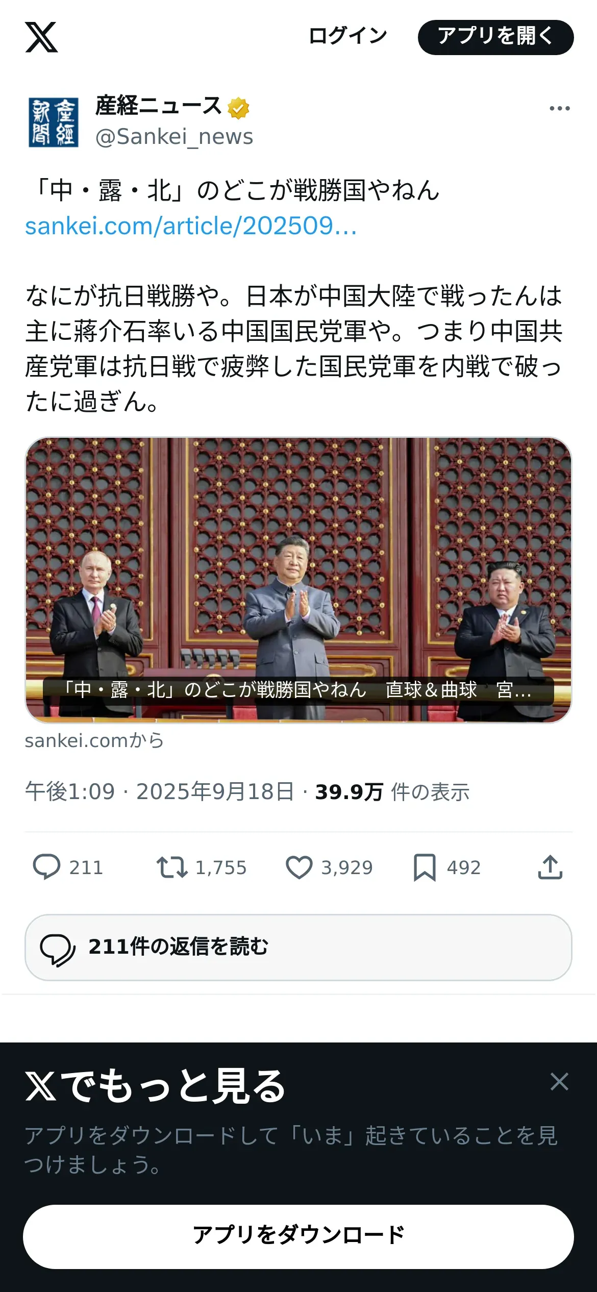 https://x.com:443/Sankei_news/status/1968527664899326257?t=A13AAT-LamjQp9vuG9FbkQ&s=19