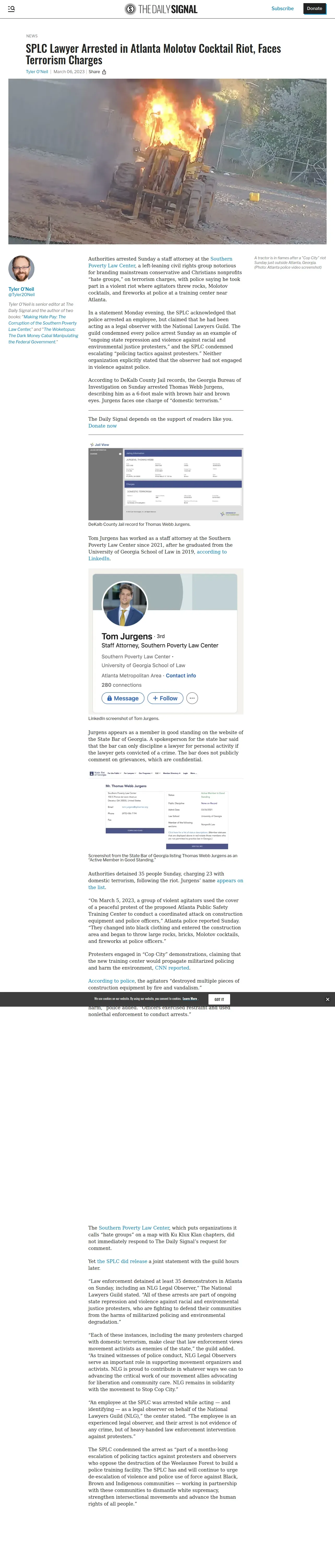 取得元URL: https://www.dailysignal.com:443/2023/03/06/splc-lawyer-arrested-atlanta-molotov-cocktail-riot-faces-terrorism-charges/