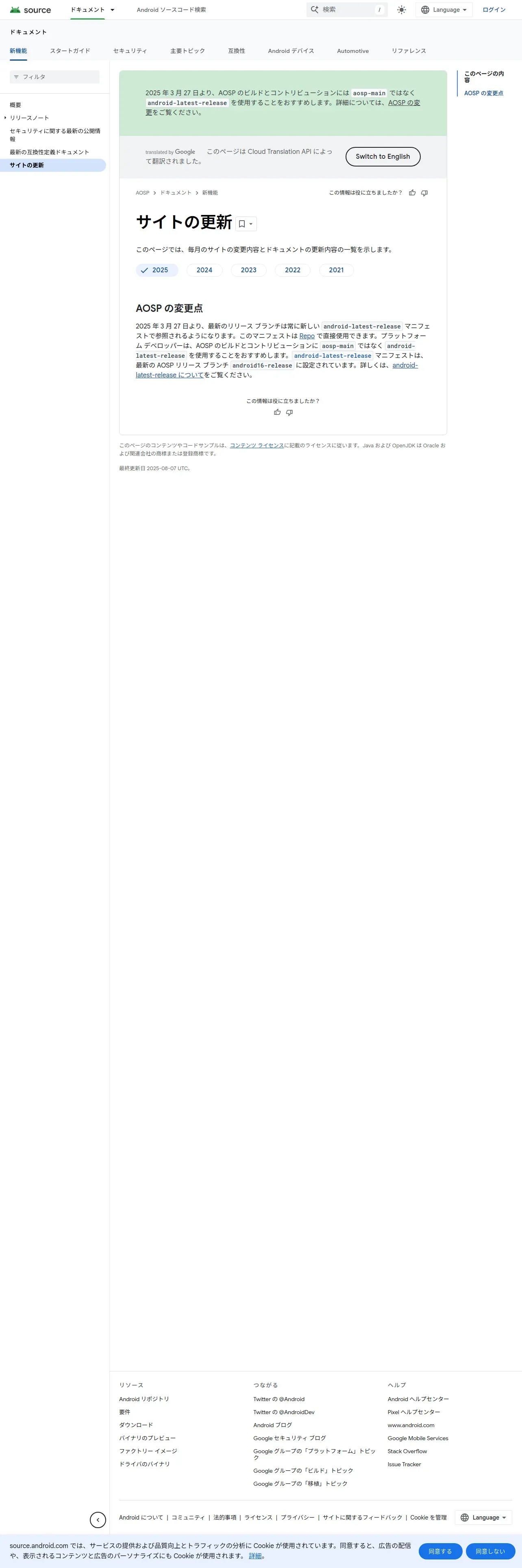 https://source.android.com:443/docs/whatsnew/site-updates?hl=ja
