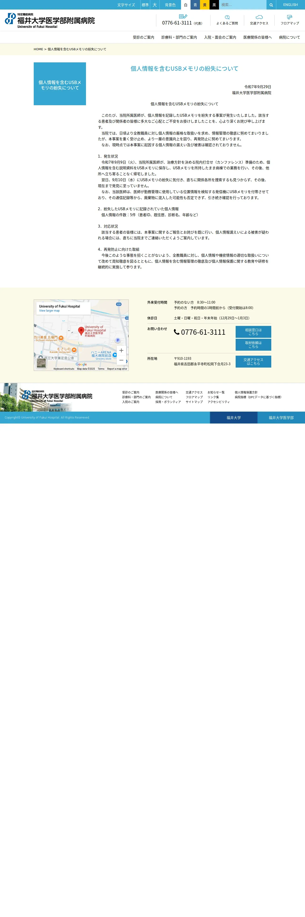 https://www.hosp.u-fukui.ac.jp:443/%e5%80%8b%e4%ba%ba%e6%83%85%e5%a0%b1%e3%82%92%e5%90%ab%e3%82%80usb%e3%83%a1%e3%83%a2%e3%83%aa%e3%81%ae%e7%b4%9b%e5%a4%b1%e3%81%ab%e3%81%a4%e3%81%84%e3%81%a6/