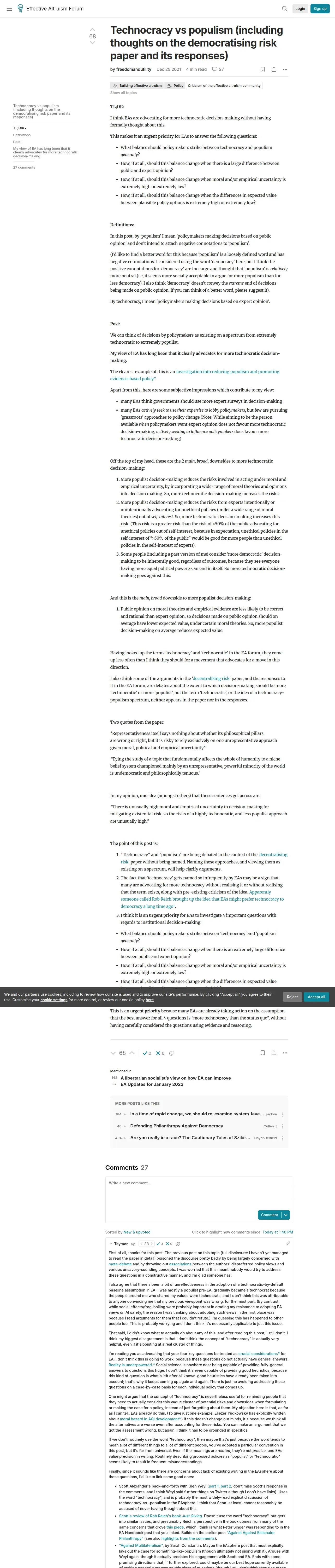 https://forum.effectivealtruism.org:443/posts/yrwTnMr8Dz86NW7L4/technocracy-vs-populism-including-thoughts-on-the