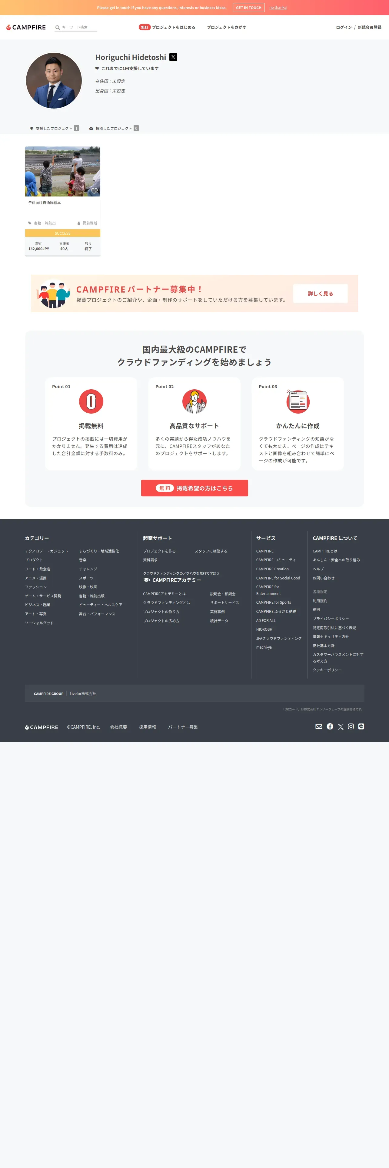 取得元URL: https://camp-fire.jp:443/profile/Horiguchi%20Hidetoshi