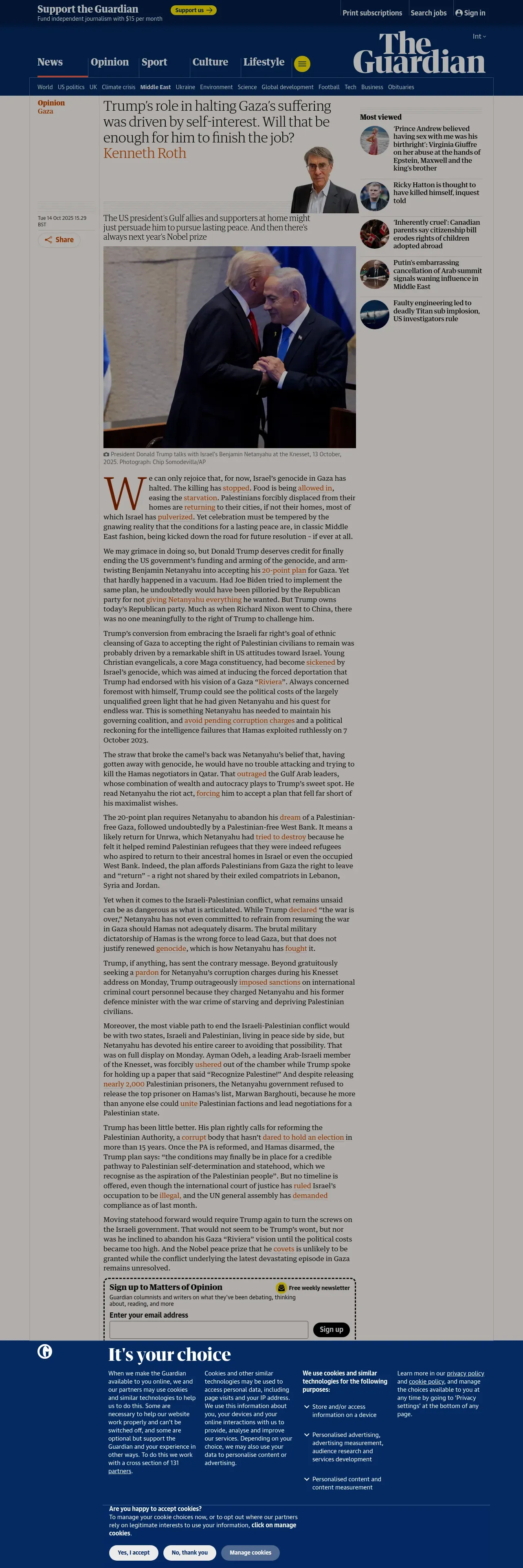 https://www.theguardian.com:443/commentisfree/2025/oct/14/trump-halting-gaza-suffering-self-interest