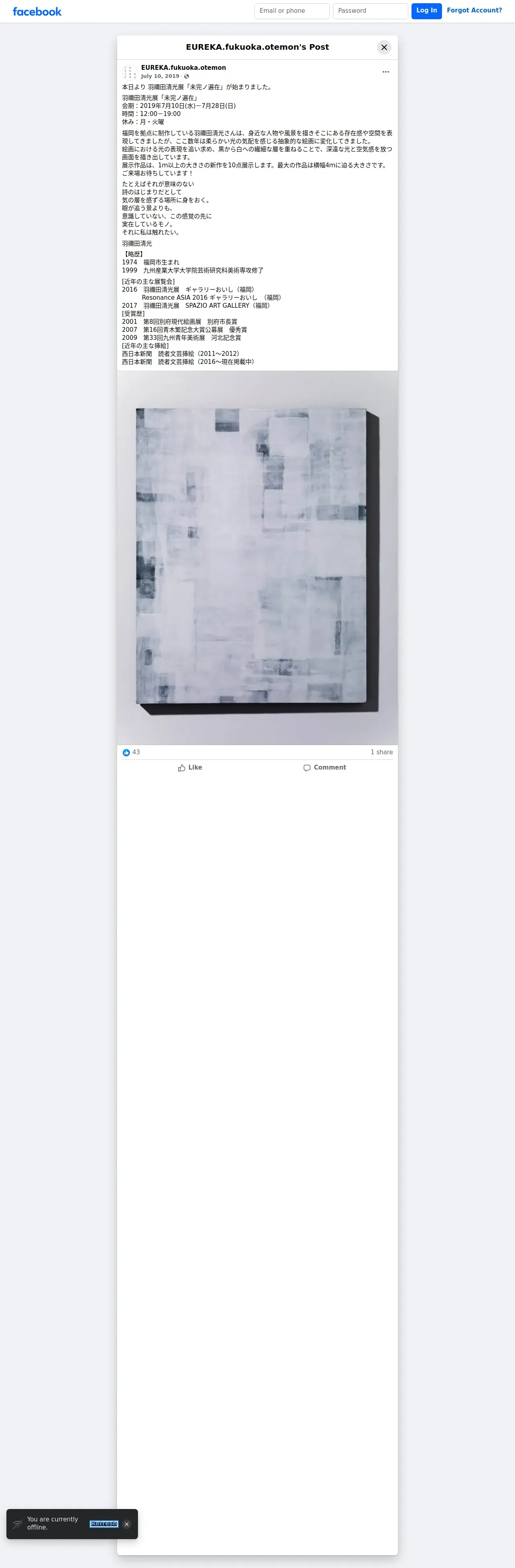 https://www.facebook.com:443/EUREKA.fukuoka.otemon/posts/%E6%9C%AC%E6%97%A5%E3%82%88%E3%82%8A-%E7%BE%BD%E7%A6%B0%E7%94%B0%E6%B8%85%E5%85%89%E5%B1%95%E6%9C%AA%E5%AE%8C%E3%83%8E%E9%81%8D%E5%9C%A8%E3%81%8C%E5%A7%8B%E3%81%BE%E3%82%8A%E3%81%BE%E3%81%97%E3%81%9F%E7%BE%BD%E7%A6%B0%E7%94%B0%E6%B8%85%E5%85%89%E5%B1%95%E6%9C%AA%E5%AE%8C%E3%83%8E%E9%81%8D%E5%9C%A8%E4%BC%9A%E6%9C%9F2019%E5%B9%B47%E6%9C%8810%E6%97%A5%E6%B0%B47%E6%9C%8828%E6%97%A5%E6%97%A5-%E6%99%82%E9%96%9312001900%E4%BC%91%E3%81%BF%E6%9C%88%E7%81%AB%E6%9B%9C%E7%A6%8F%E5%B2%A1%E3%82%92%E6%8B%A0%E7%82%B9%E3%81%AB%E5%88%B6%E4%BD%9C%E3%81%97%E3%81%A6%E3%81%84/2624546580891029/